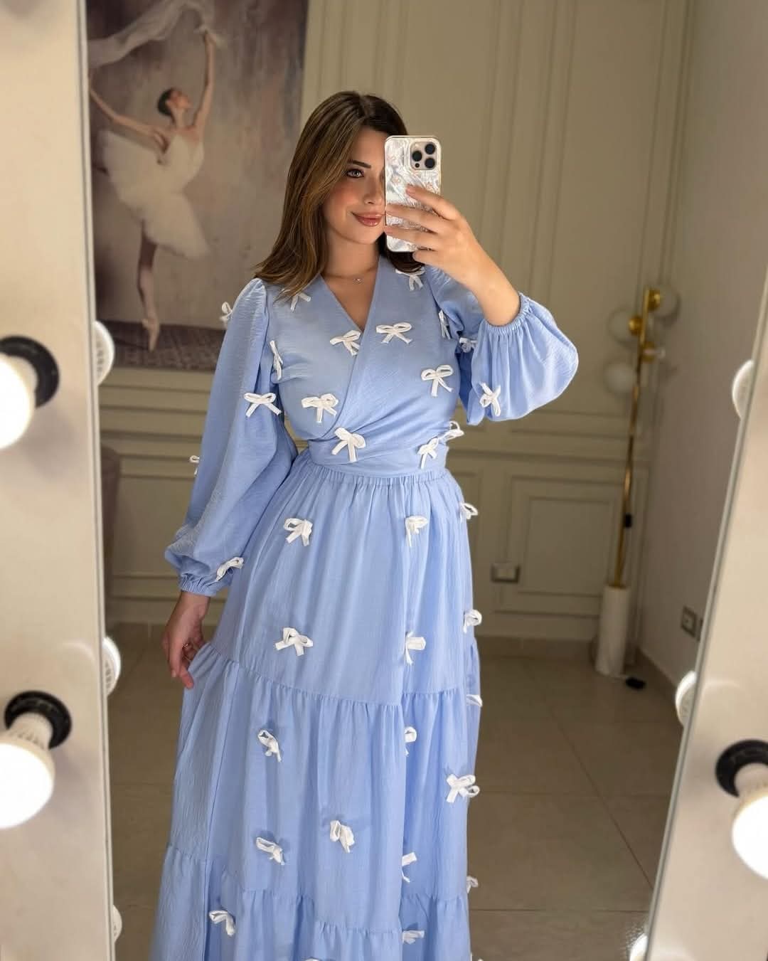 • পুরো ড্রেসজুড়ে রয়েছে ছোট ছোট বো ডিজাইন, যা ড্রেসটিকে দেয় একটি ইউনিক ও ক্লাসি লুক
